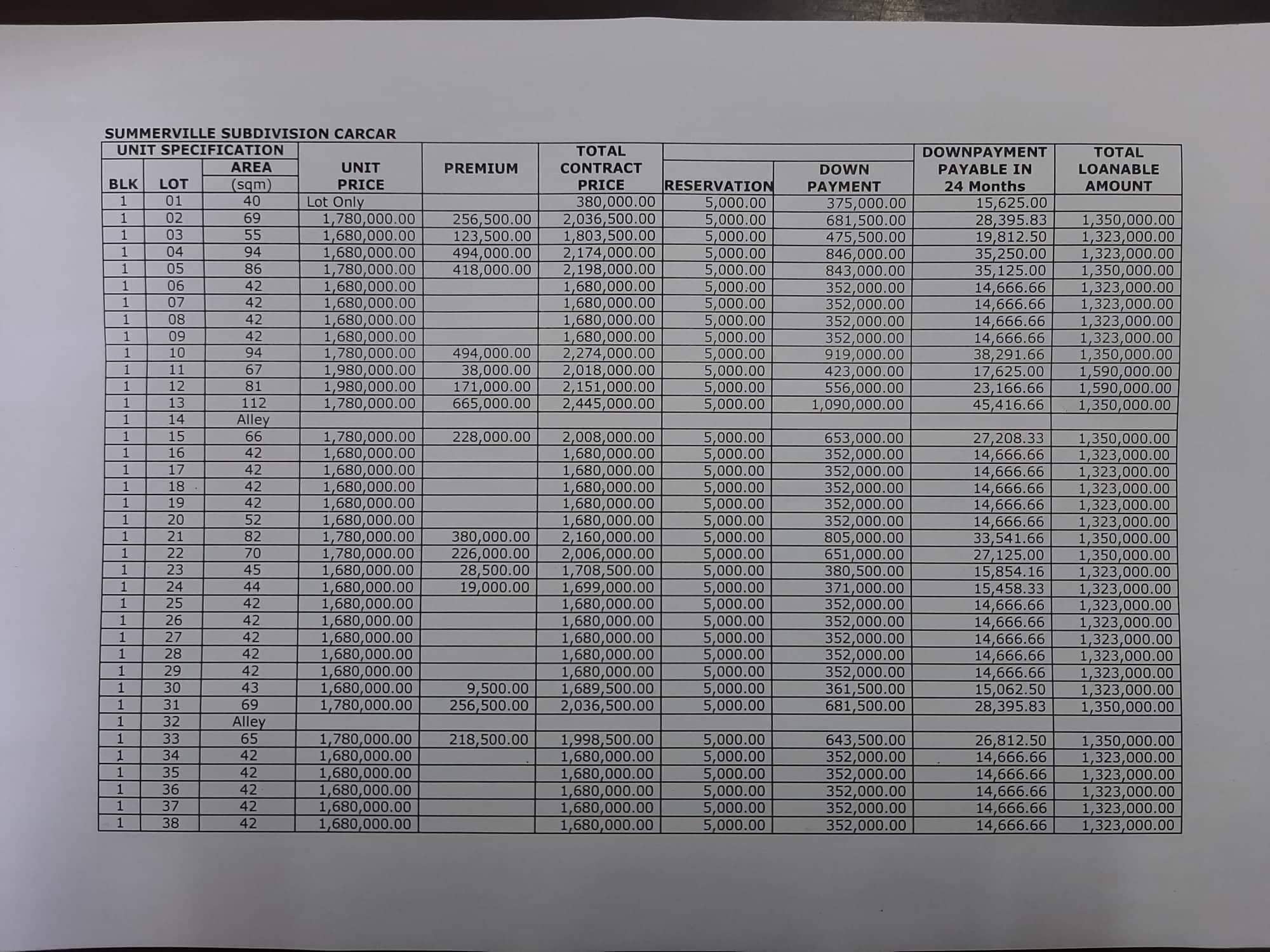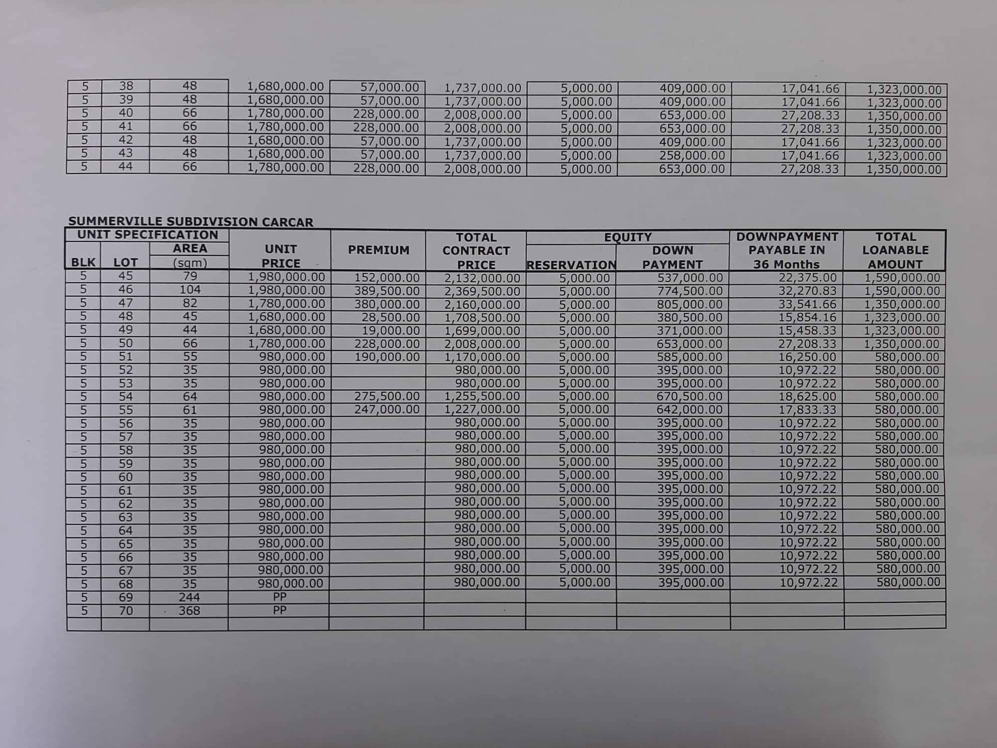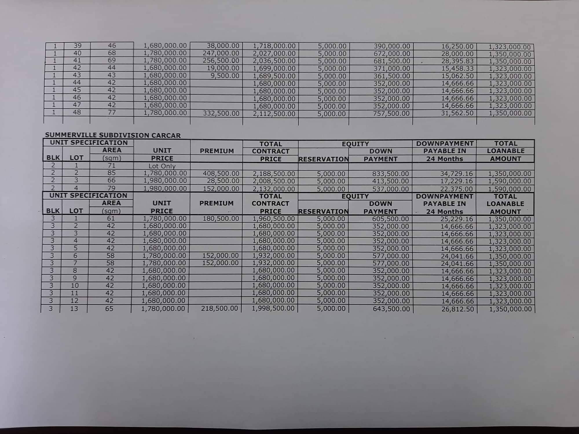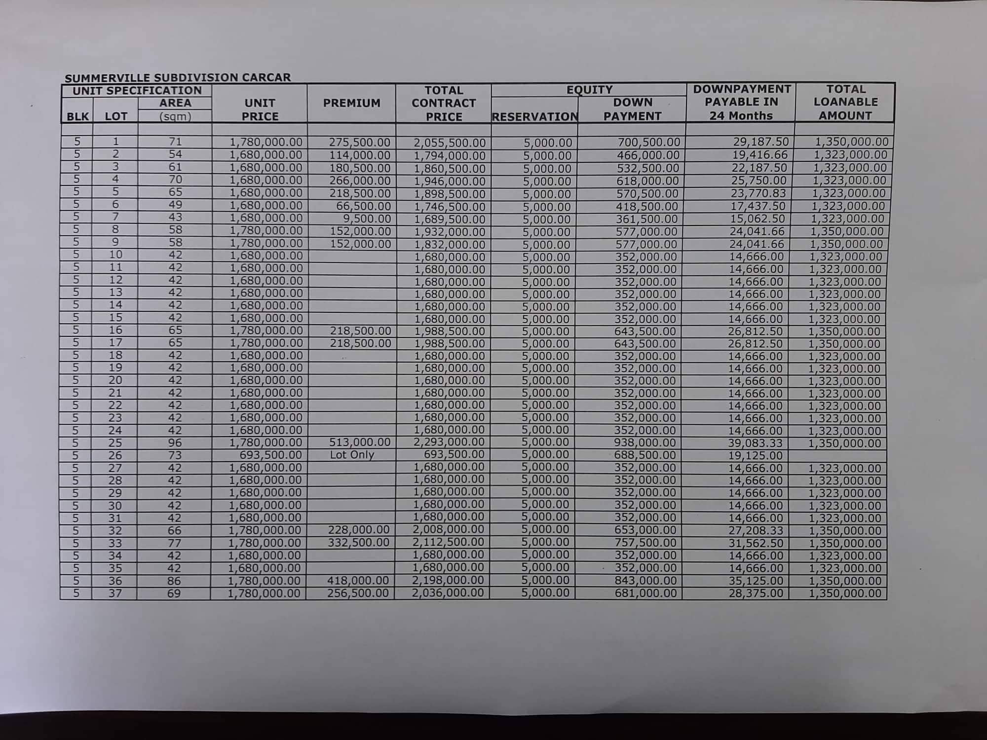 Please see below Pricelist of Summerville Subdivision - Carcar for other units based on the corresponding block & lot area: (Note: price is subject to change without prior notice.) This does not represent the actual Inventory update. Please contact us(09235495080) for the latest Availability